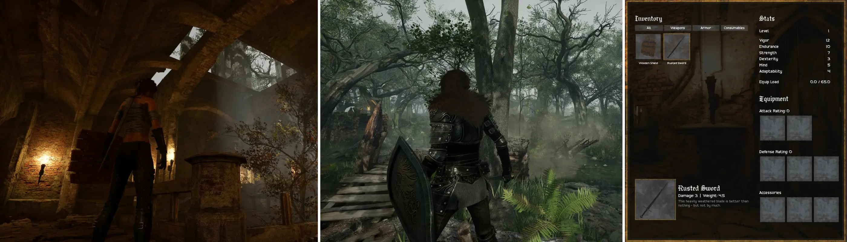 Players fight through dungeon floors of increasingly dangerous enemies, equipping collected weapons and armor, managing stamina for every combat action, and breaking enemy posture to land finishing moves.