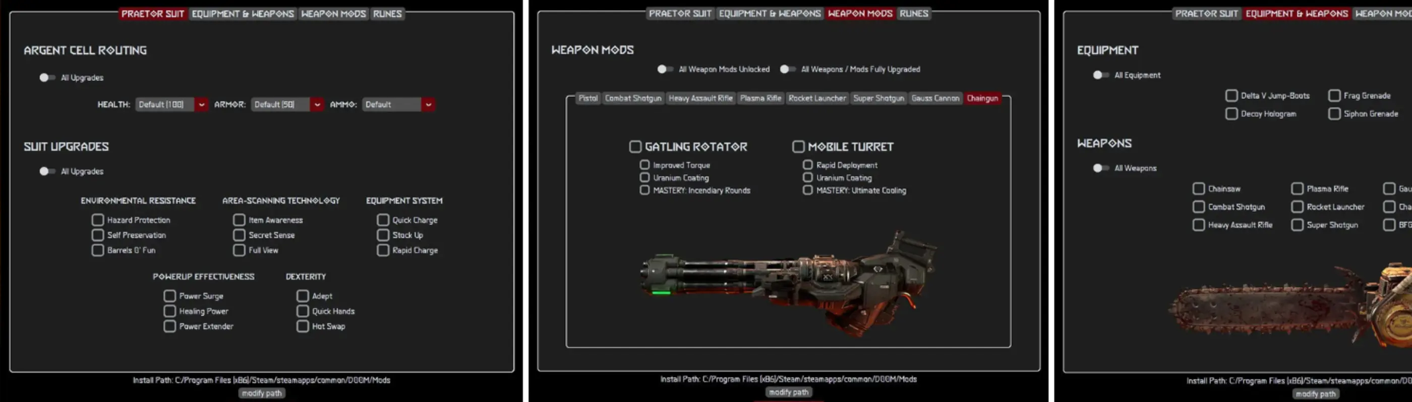 A desktop modding tool for DOOM (2016) that lets players define custom starting inventories — equipment, weapons, weapon mods, suit upgrades, and runes — and generates the .decl mod files the game engine reads. Python dataclasses model the game's internal systems as a three-level inheritance hierarchy: abstract base elements specialize into perks and items, which further specialize into eight concrete types matching DOOM's inventory categories. A validation layer enforces the game's own balance constraints, preventing configurations that would break progression. Published on NexusMods with a GUI built for non-technical players, auto-detecting the local game installation and deploying generated mods directly.