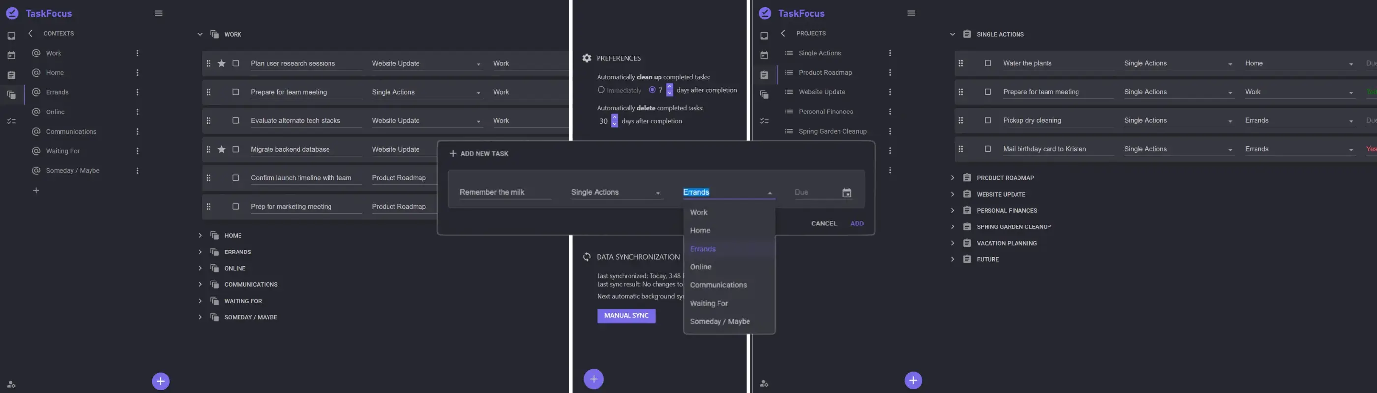 - GTD-inspired views — Inbox, Today, Projects, Contexts, and Completed — with per-view drag-and-drop ordering